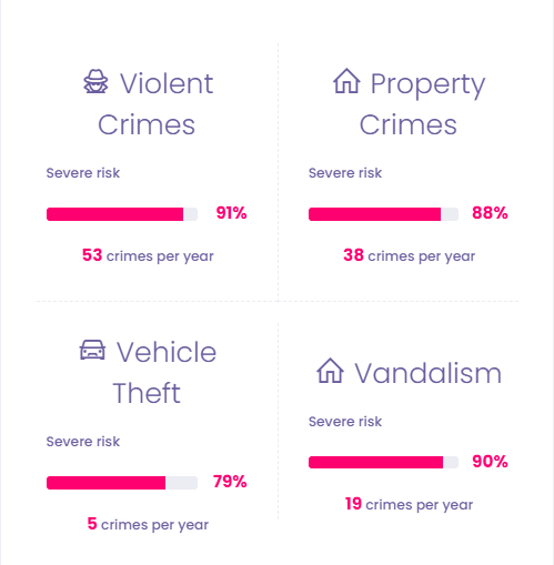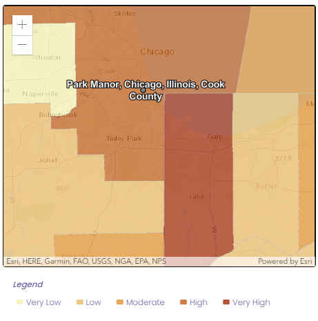 The Crime Score for Park Manor area, Chicago, Illinois is severe (90.36%), according to the Augurisk Crime Risk Assessment. On average, the Augurisk machine-learning algorithm expects 53 violent crimes and 38 property crimes to occur in one year within this block group.